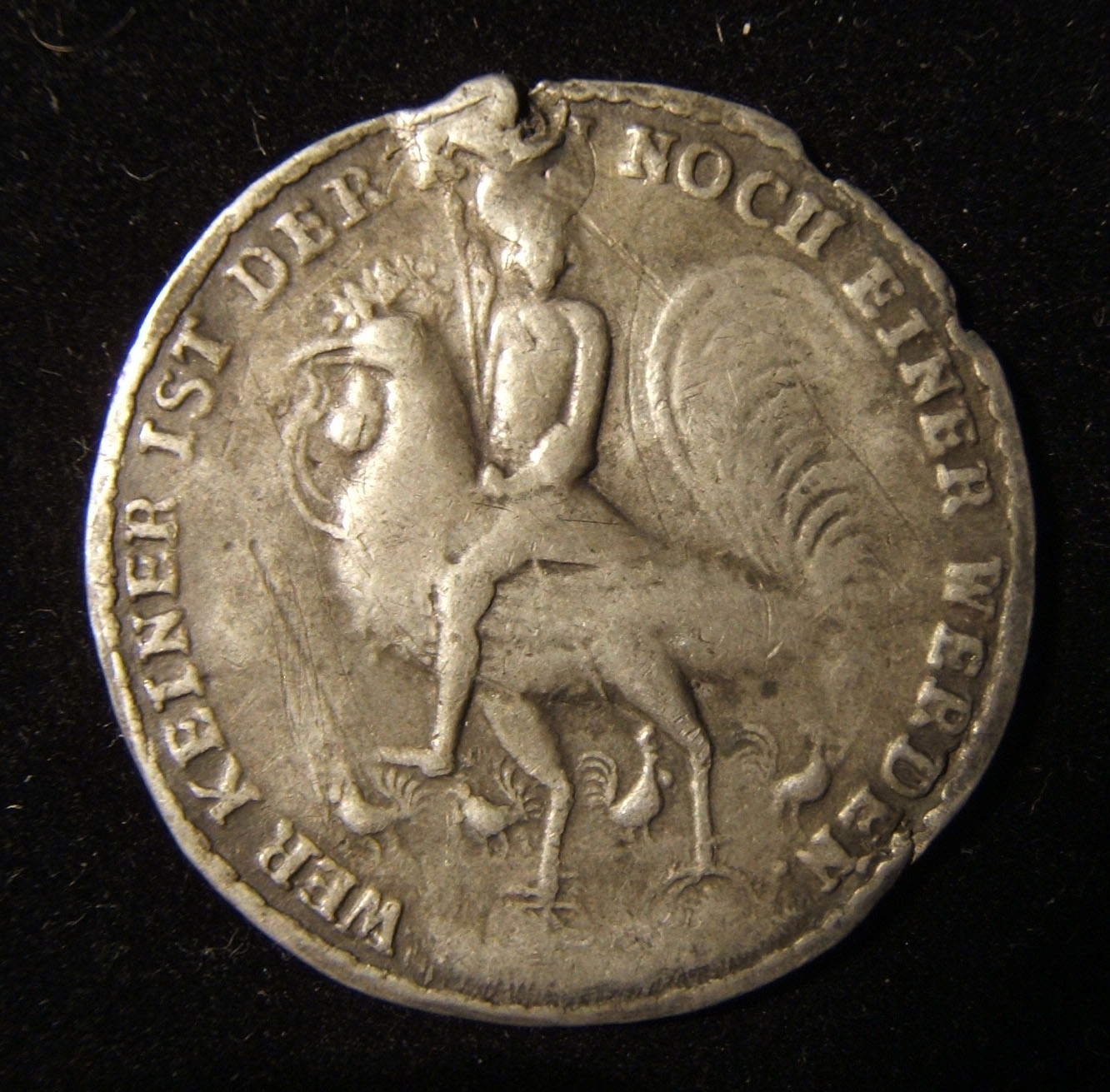 Still another “Cuckold Medal” with the “Feather Jew” motif is shown in figure 11. The obverse of this one depicts a two antlered Jew riding a large cock, with four smaller roosters in the background; the German legend rim reads (“Where No One Can Become Someone"). The reverse shows an ornately decorated open chest a with pair of antlers, the legend reading, "DIE LADE FVHRT DIE GROSTE ZVNFFT AVF ERDEN" and below in smaller letters "VM MANCHEN IST ES EWIG SCHADE" (The Clouds Drove the Guild off the Ground, to Some it Is a Shame Forever); the German legend on box reads DAS ER KOMT/ IN DIE/ HAHNREY / LADE (That He May Land in the Drawer of Cuckolds).