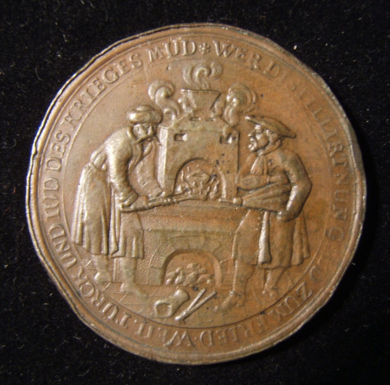 The medal (figure 14) depicts on the obverse Turkish and Jewish figures around a furnace melting metal, with the Turk holding tongs and the Jew holding bellows. Ingots appear at the bottom of the furnace. The legend around translates as, “Who Mints Money for Peace Now That the Turk and Jew Are Tired of War?” The reverse legend reads as, “Ofen Belongs to Leopold. Luck Has Been Against Mohammed. He Loses the City of Ofen with All its Gold, Which Was Destined to Be Used for the Purchase of Peace.” Along the rim is written, “By this Battle the Turkish Empire Nears its End.”