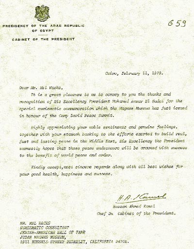 Camp David Peace Accord; receives "thank you" notes from President